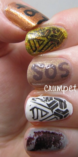 The Dharma symbol dominated Season 2, and here it's represented on the forefinger and the ring finger. On the index finger, it's over a layer of NerdLacquer Gorramit, sponged with CG Westside Warrior, to give it that mossy, dirty, aged look. On the ring finger, it's just over SH White On. Both nails are stamped with RA 114. I used it the other week for a stamping challenge and there was just something about it that reminded me of the Dharma symbol.
