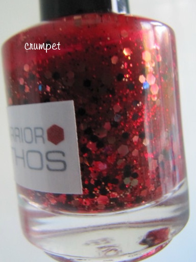 Siiiiiiigh, where shall I begin? Ok, let's talk mechanics, and then magic. Warrior Ethos is an amazing crimson jelly, thick and gooey with good glitter. She has gold pieces (which change colour when layered with jelly), small holo pieces with give an unexpected violet flash, normal micro glitter, and my favourite, small black glitter. Quite simply, the combination is stunning.
