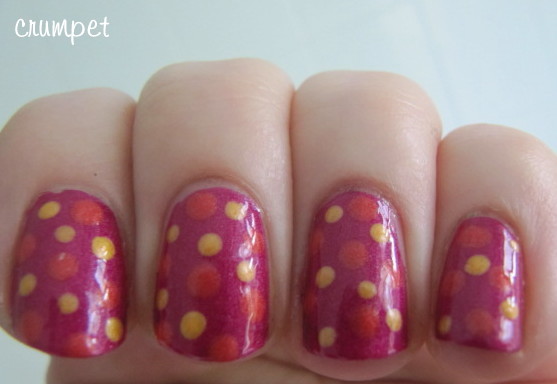 This is 2 coats of the glorious Lesbihonest from ManGlaze, a deep, dark, troubled fuchsia with veiled depths. I matched it with dots in the equally vibrant ManGlaze Butt Taco and a scary neon egg yolk yellow from Stargazer.