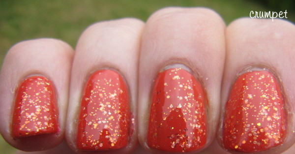 Cult Nails describe Captivated as a "coral jelly packed with coral and gold glitter". I think because I wore it over a coral polish, I could only really see the gold, but wow what a lovely combo.