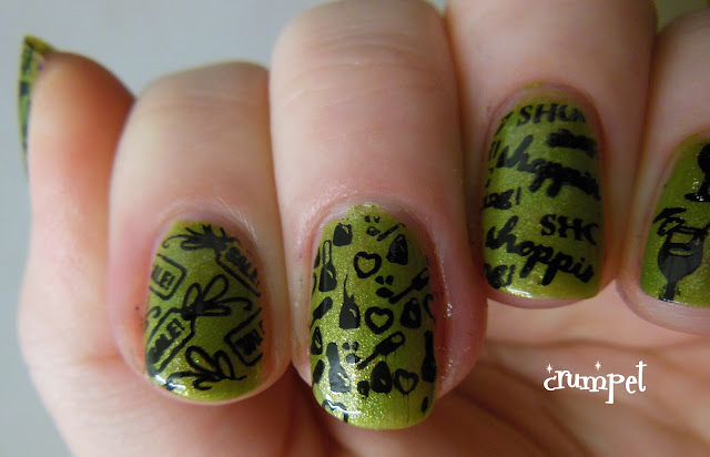The base is Butter London Dosh, a lovely mushy pea green with hints of gold. I'm going to run you through the stamps 1 by 1 -